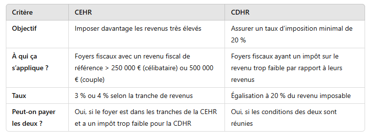 En résumé, la CDHR ne remplace pas la CEHR mais vient compléter le dispositif fiscal pour éviter que certains contribuables ne payent trop peu d’impôts malgré des revenus élevés. La CEHR vise les tranches de revenus élevés tandis que la CDHR s’assure que l’impôt total atteint au moins 20 % du revenu imposable.